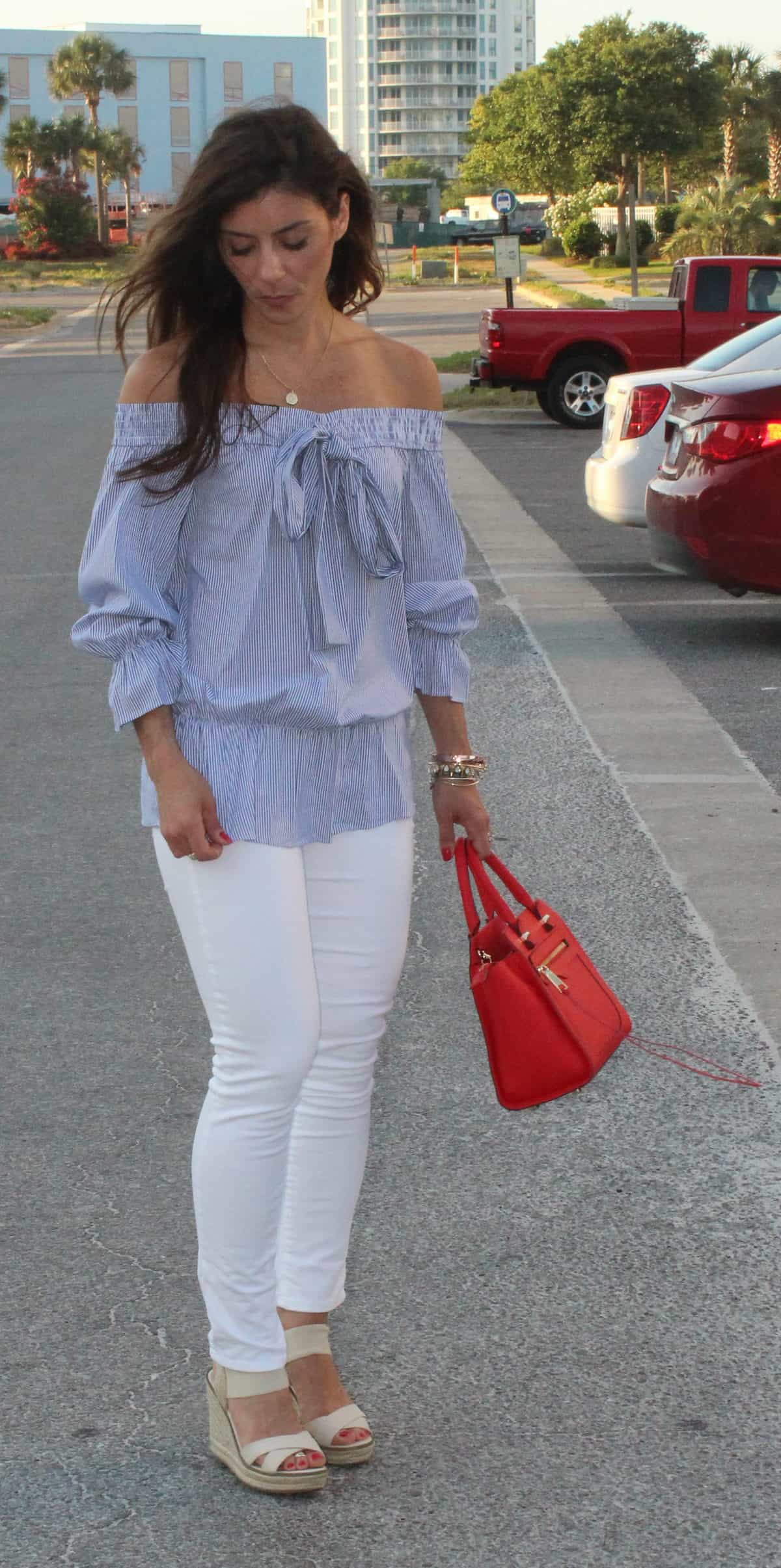 Off the shoulder top / sandals / white jeans / bag