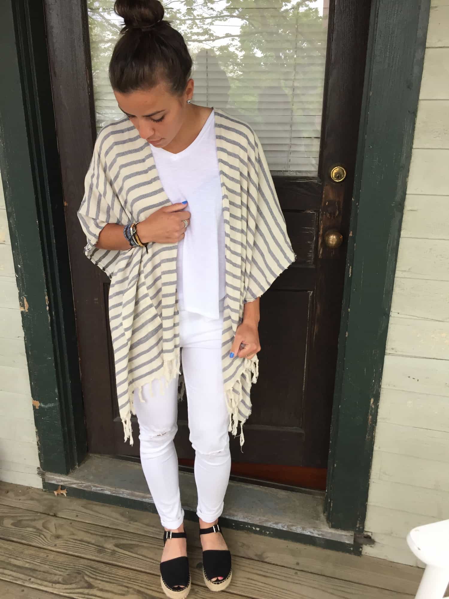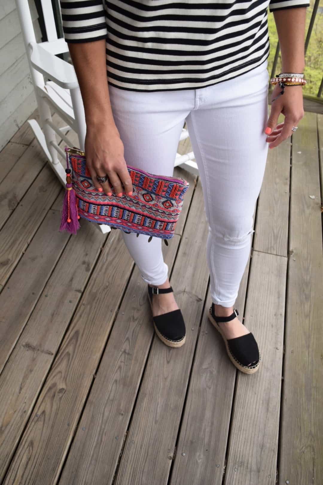 white jeans/ striped top/ clutch / espadrilles