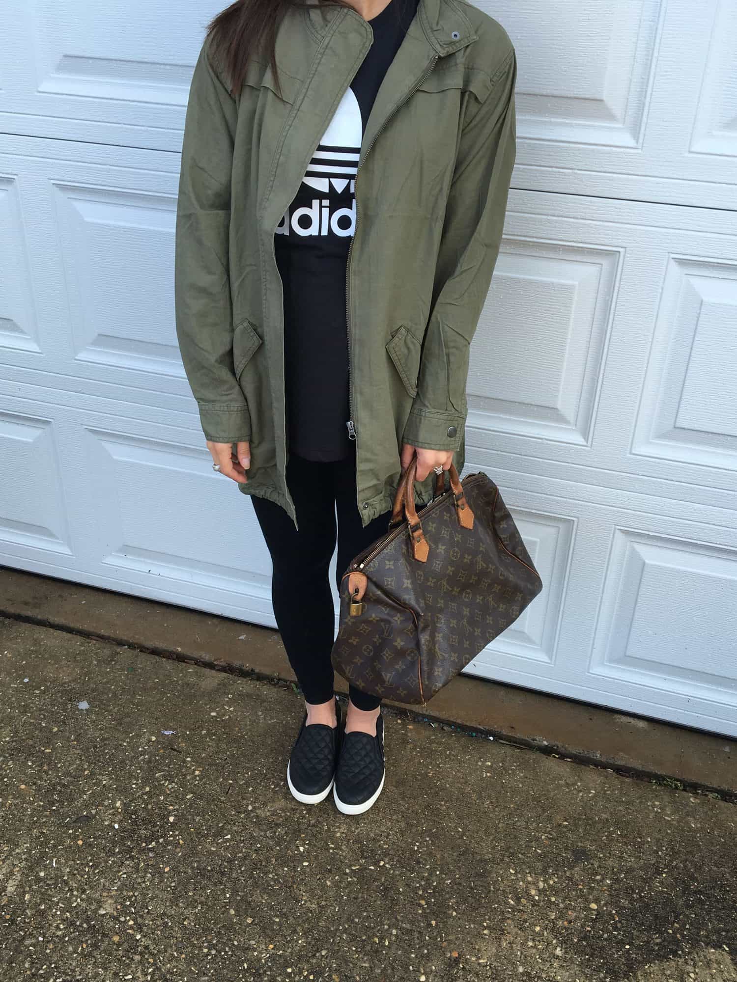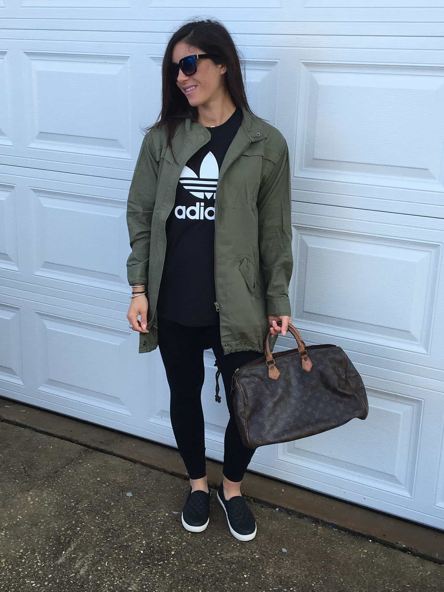slip ons / shades $24 / legging (this brand is a must) / adidas top / mac blankety lipstick / preowned LV BAG