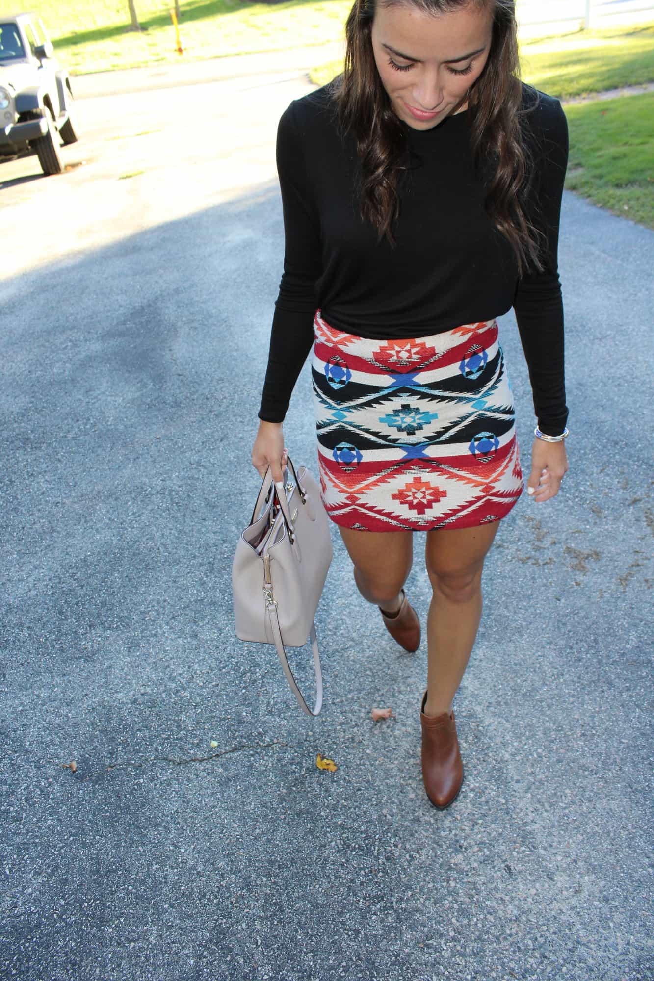 I first became obsessed with this southwestern aztec print last year when visiting my boyfriend while he lived in New Mexico. I love this print first and for most because it reminds me of him and the time we spent there. I also love this print because it adds character and tells a story in any outfit. This print represents more than just a cute pattern, it represents a happy time in my life spent in Santa Fe and Albuquerque exploring new places. Any time I see it I am immediately drawn to it! Also, love how versitale this skirt is wear it with booties, or tall boots (like these uggs), drape a sweater over it or it with a turtleneck and tights!