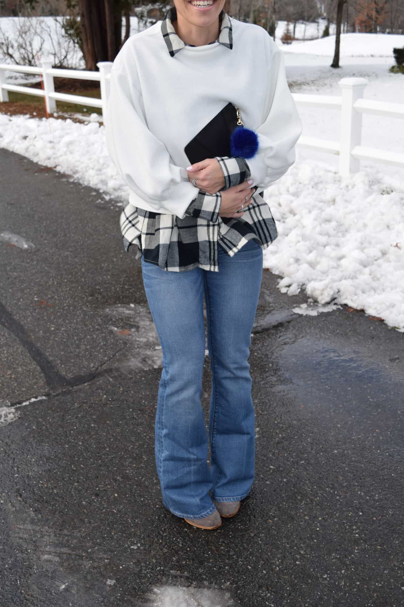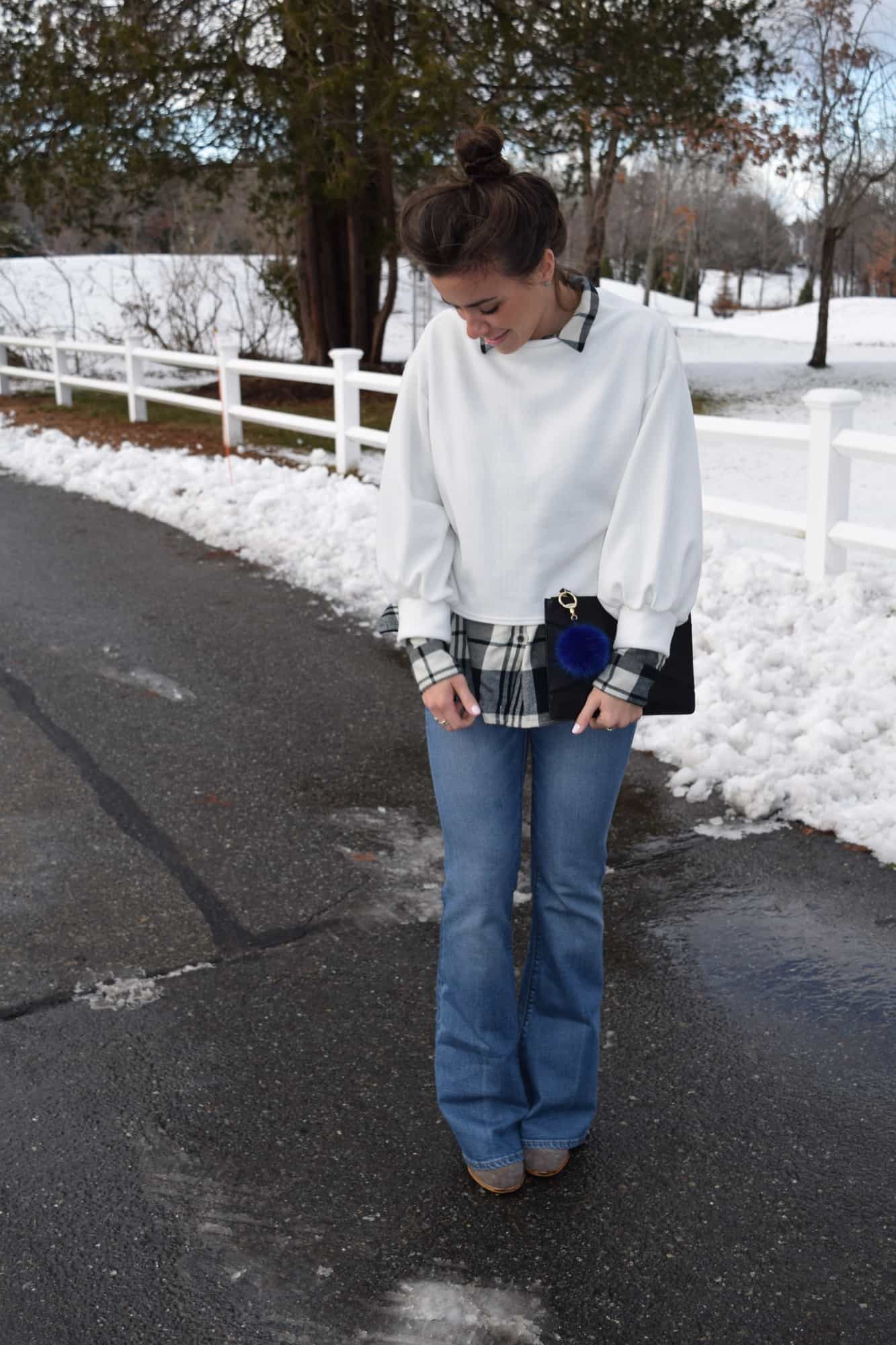 Jeans – White Sweater – Flannel – Booties – Clutch & Pom-Pom