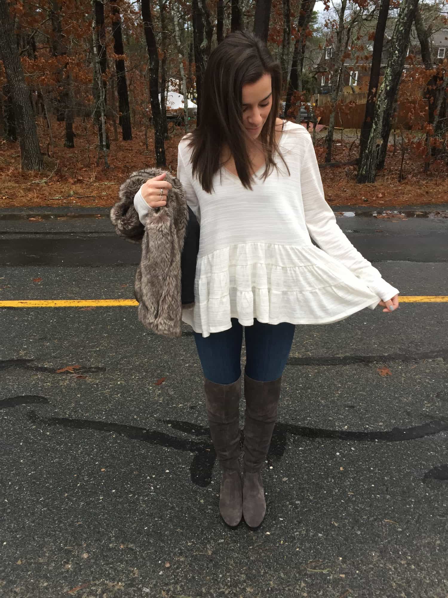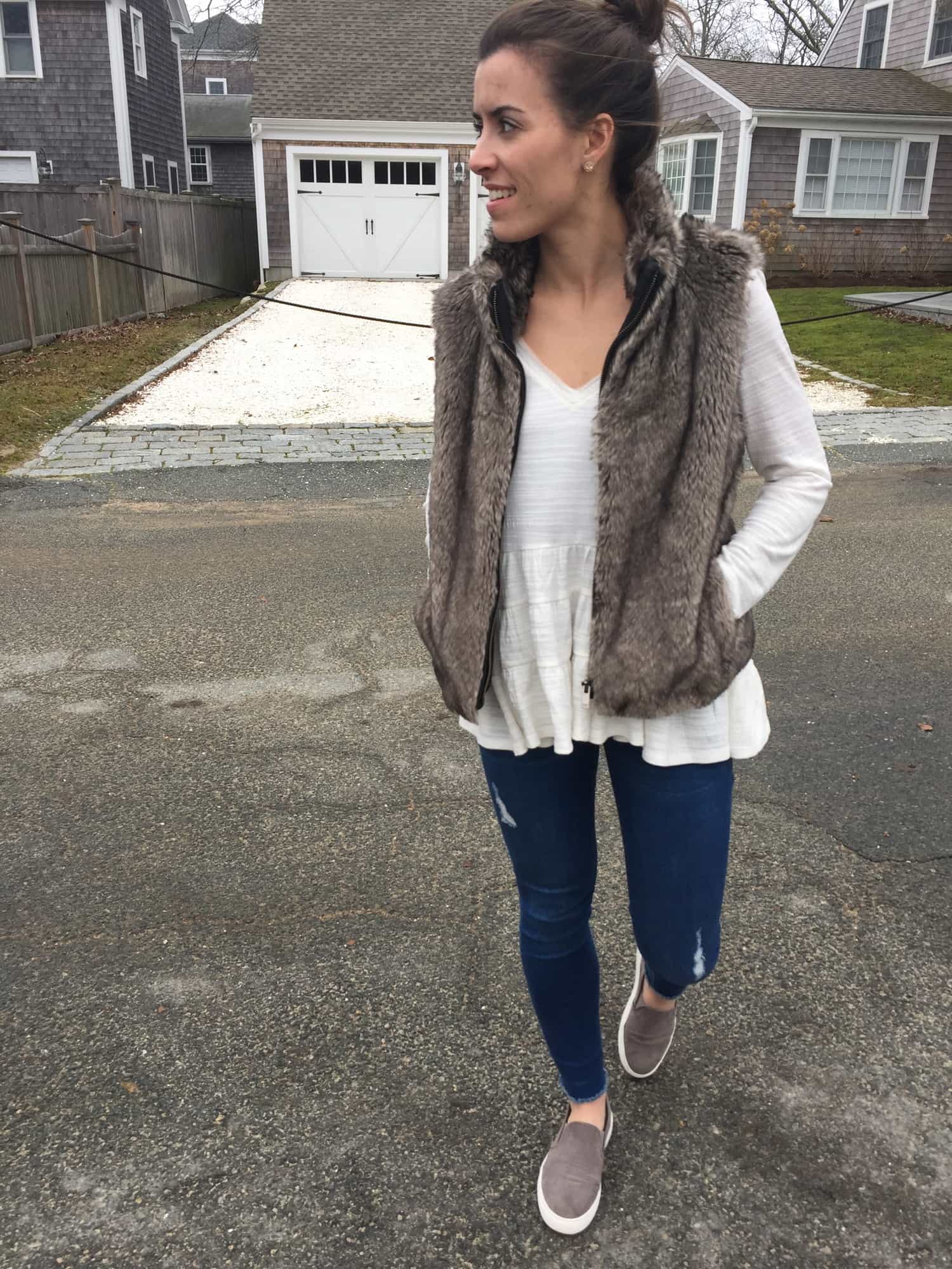 Ruffle Top – Jeans – Fur Vest – Sneaker Flats