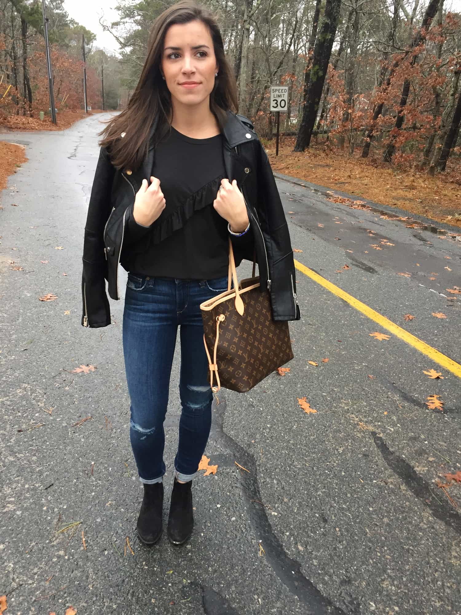 Top – Leather Jacket (major sale!!) – Jeans – Booties – Louis Vuitton Bag