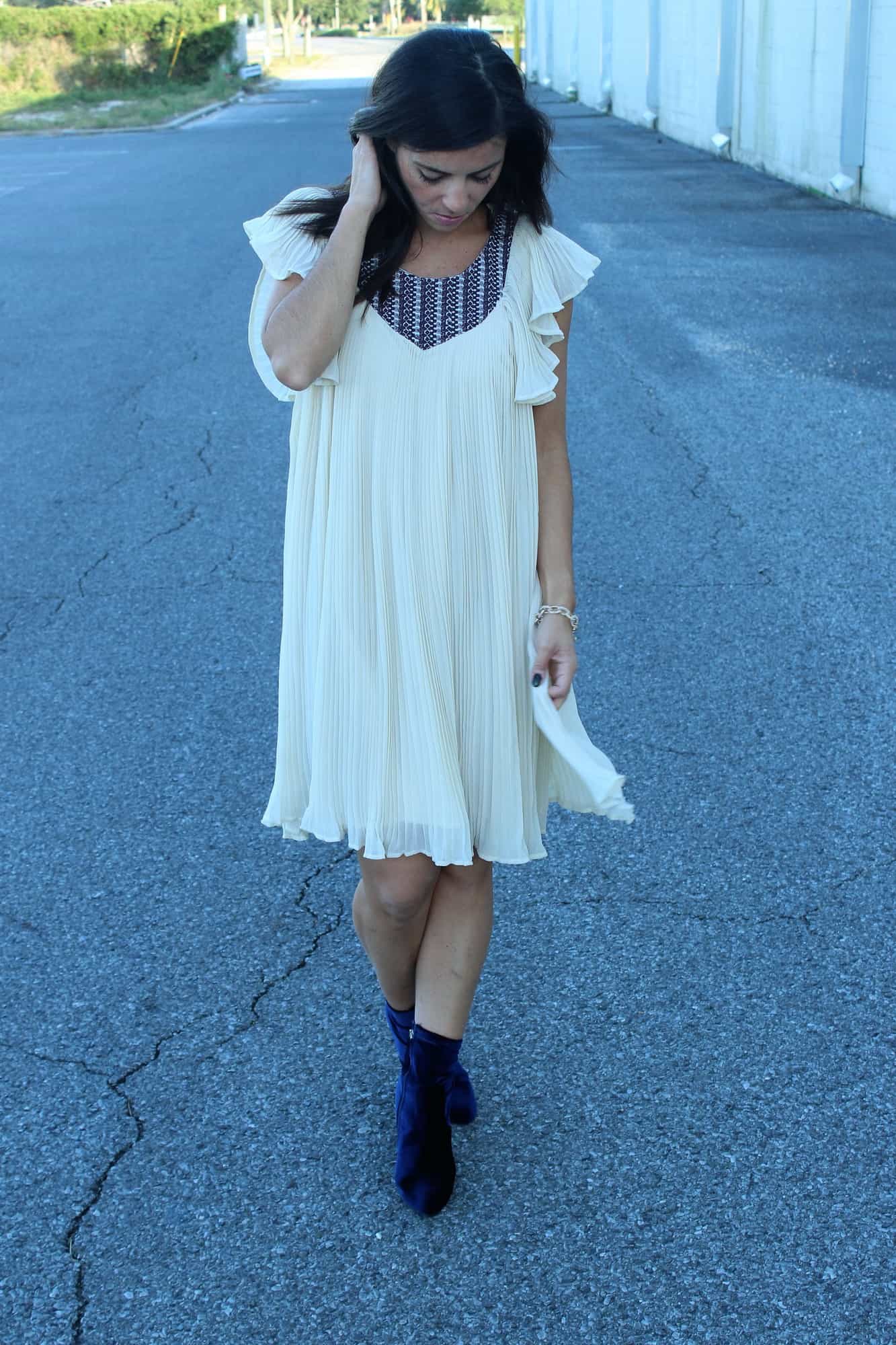 I ordered this dress online and was a bit skepitcal like I am about any online order, but actually liked it even more in person! I tend to go for dresses a little longer in legnth, but not too long that they make me look short. This dress is the perfect length! I am wearing size 4 and I am 5’5. You all have seen these velvet booties before, but I can’t get enough. They come in four colors are are under $100! When I shot this look it was still mid 80’s in Florida! This week I am enjoying some cooler weather in Alabama…picts to come! I love the Birmingham area shopping! 🙂